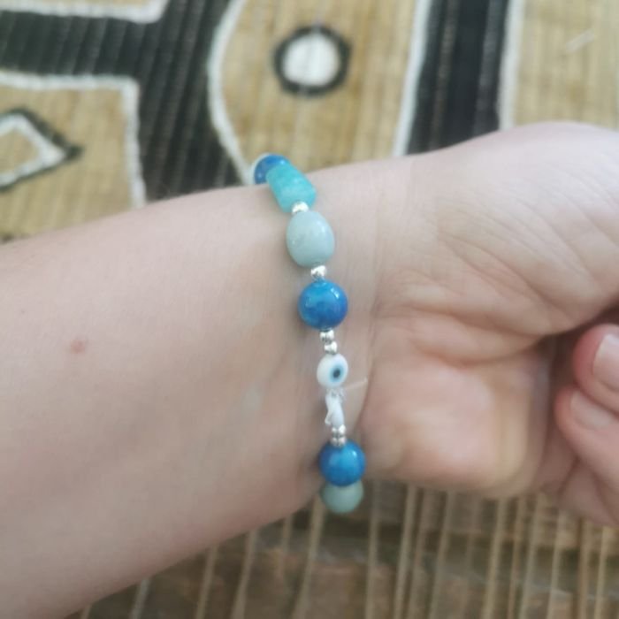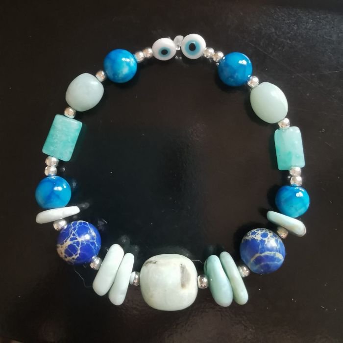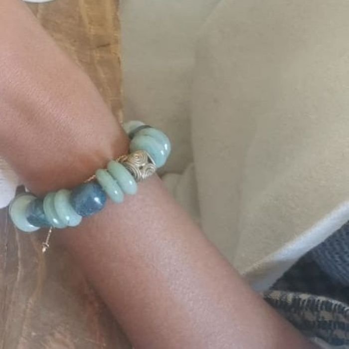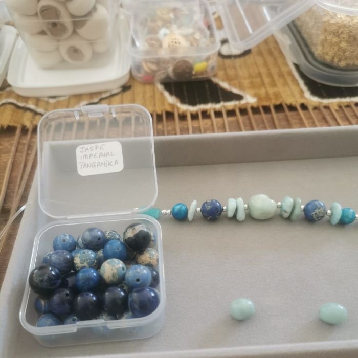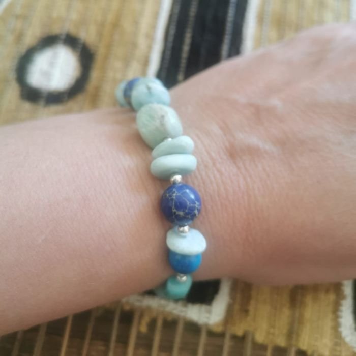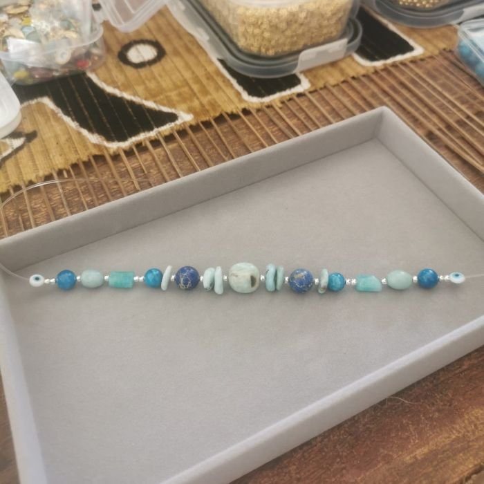 Vous choisissez vos pierres (amazonite, agate, jaspe impérial, larimar…), vous apprenez les bases du montage, puis vous composez votre bracelet selon vos goûts (couleurs, énergie, style).